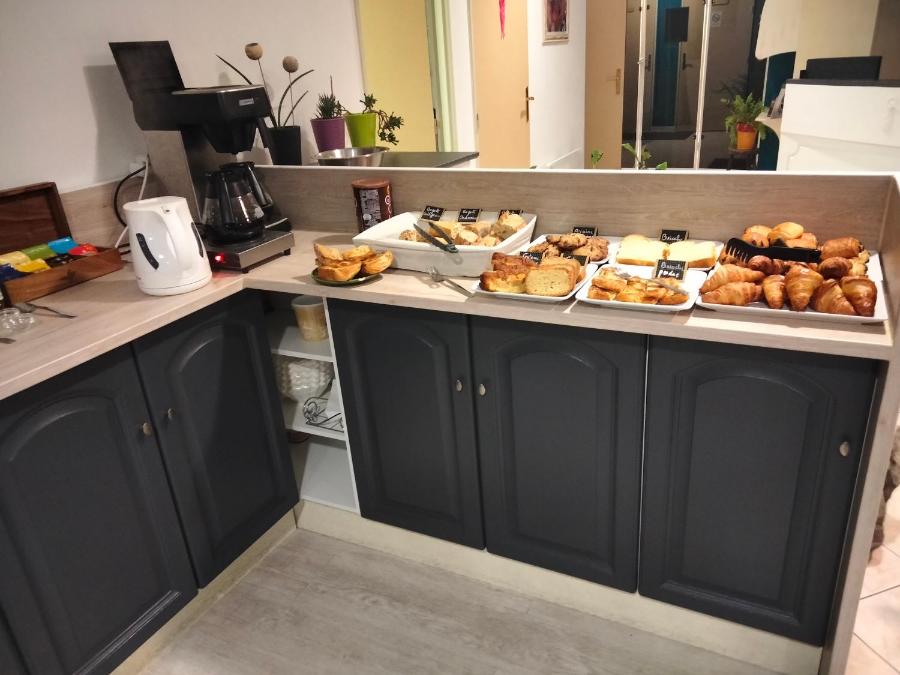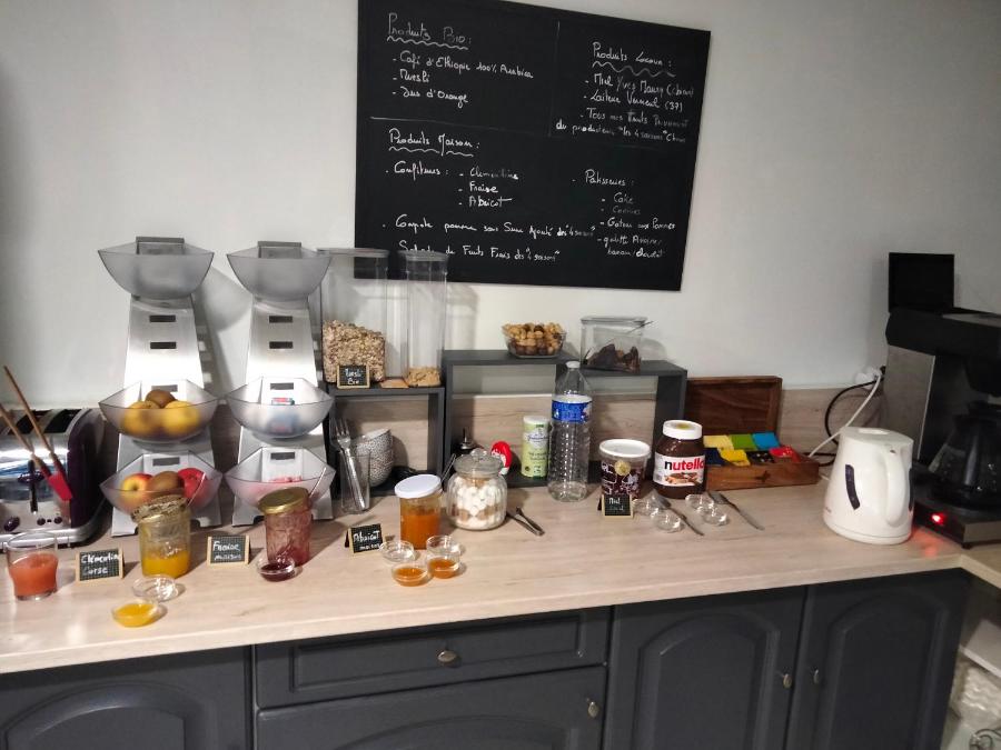 Un petit-déjeuner buffet est servi tous les jours, dans le coin repas de l'hôtel Au Sans Souci ou dans le jardin.