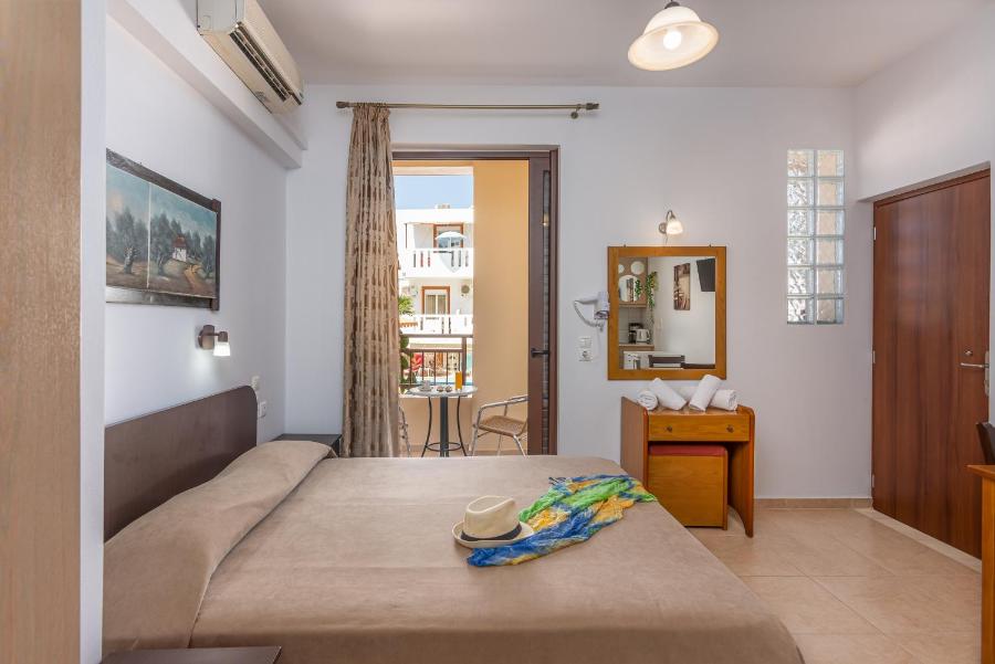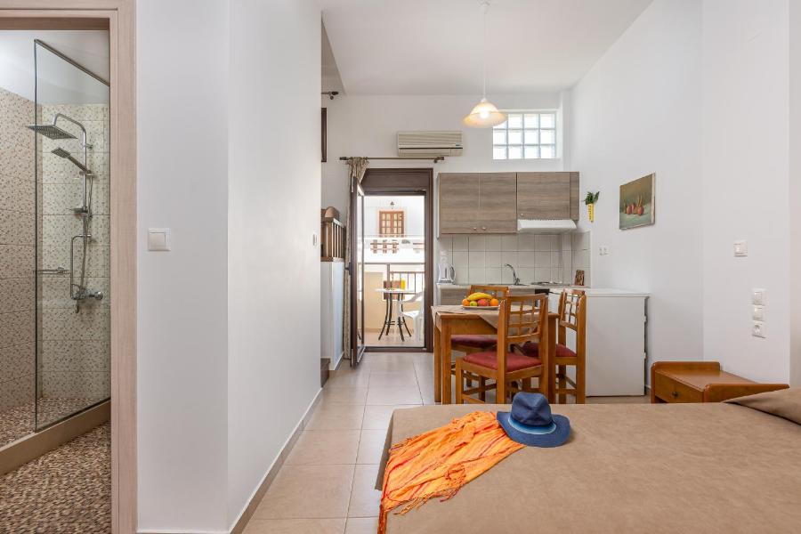 La plupart des studios et appartements offrent une vue sur la piscine. Ils disposent d'un mobilier en bois suivant le style traditionnel crétois. Ils comprennent une kitchenette équipée de plaques de cuisson et d'un mini-réfrigérateur ainsi qu'une salle de bains privative avec peignoirs.