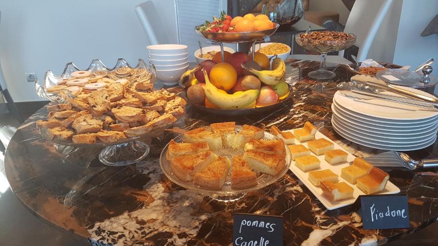 Pour votre petit-déjeuner, un buffet sucré et salé composé de pains, de viennoiseries, de jus de fruits, de produits laitiers et de fromages, de charcuterie, d'oeufs, de fruits frais et secs, de pâtisseries maison, peut être servi dans la salle intérieure ou sur la terrasse extérieure.