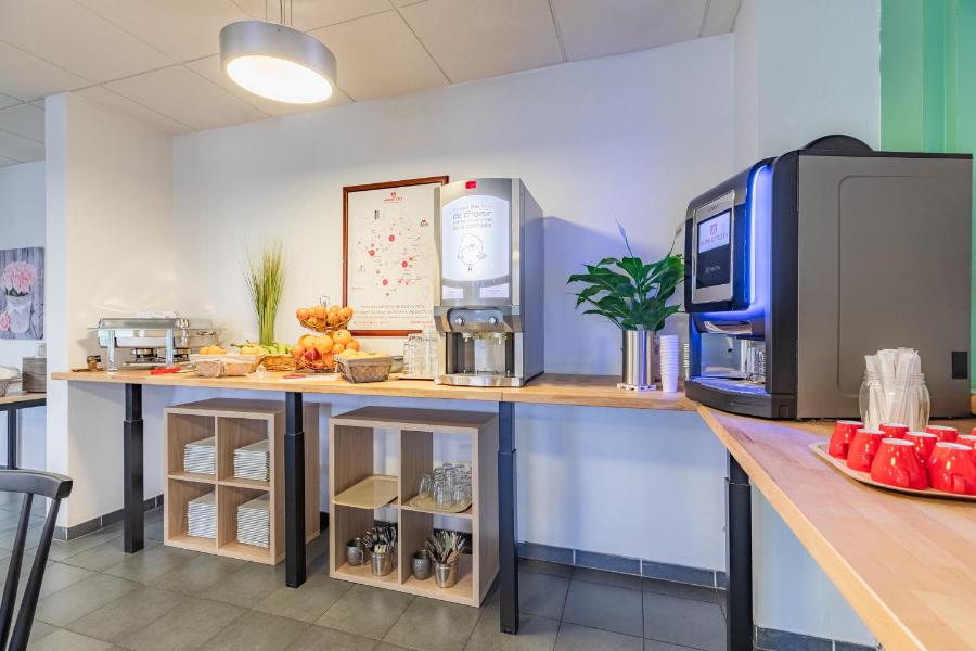 Un petit-déjeuner buffet est servi du lundi au dimanche. Il se compose d'une variété de pains, y compris sans gluten, de viennoiseries, de boissons chaudes et froides, de salade de fruits, de fruits frais, de fromages ainsi que de yaourts.