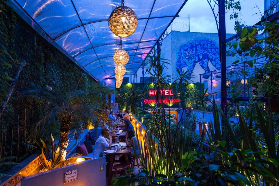 The on-site terrace hosts the Centro Cultural Parque Mexico restaurant gallery and bar, where guests can enjoy Mexican and international cuisine and gourmet cocktails and beer while enjoying park views. There is live music four time a week. A French style cafeteria, souvenir store, library and customized murals can be found inside the hotel.