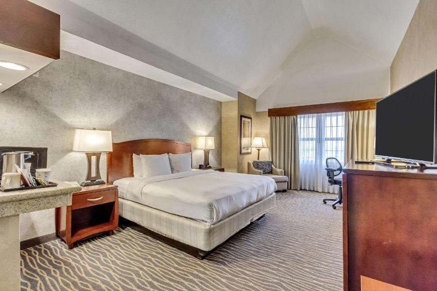 Les chambres confortables du Salt Lake Radisson sont dotées d'une télévision par câble à écran plat, d'un réfrigérateur, d'un plateau/bouilloire et d'un grand bureau.