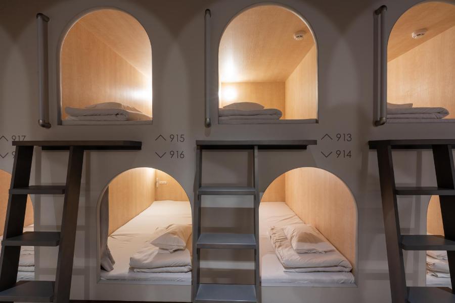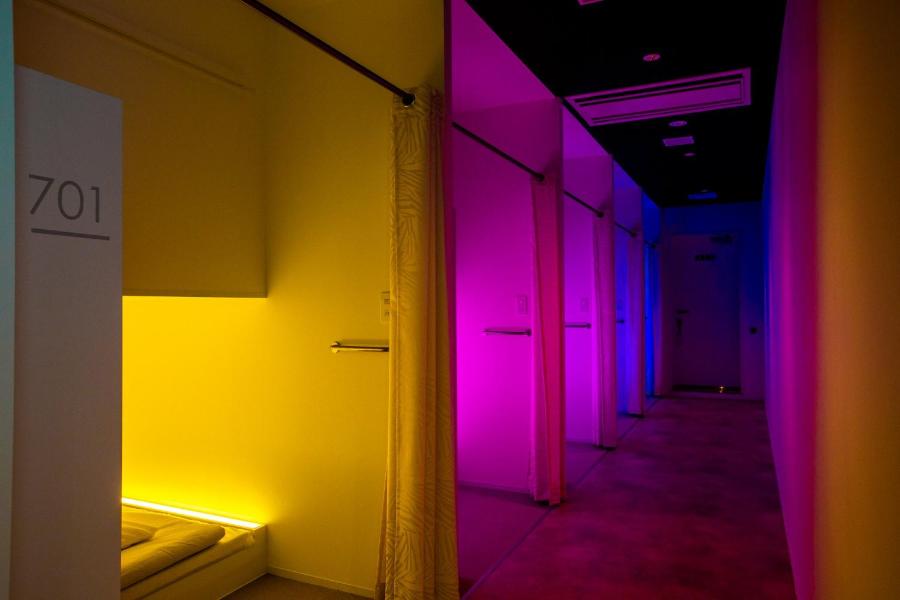 At the capsule hotel rooms come with bed linen and towels.