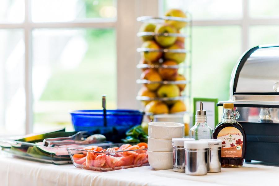Par beau temps, le petit-déjeuner est servi sur la terrasse. Il se compose notamment de produits issus du commerce équitable et de l'agriculture biologique.